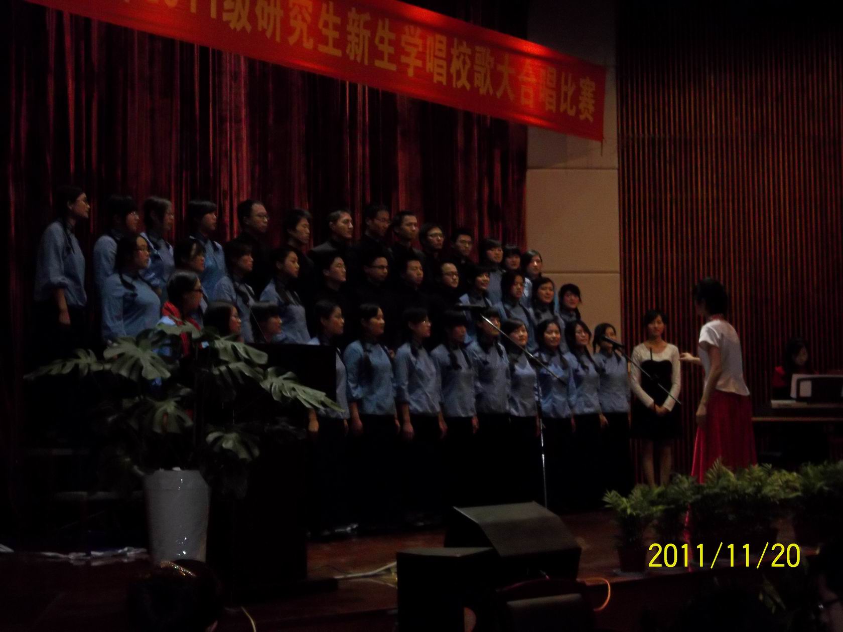 大不自多,海纳江河,白衣放歌、求是传情,树我邦国,天下来同! 20111120日晚,由浙江大学医学部主办,医学部研博会承办的2011级研究生新生学唱校歌合唱比赛在华家池校区教学楼小礼堂隆重拉开帷幕。医学部党委副书记张小玲,研工部研究生事务管理办公室副主任王莉,华家池学生管理中心主任汪苏华,医学部团委副书记李智巧、王黎芳老师担任比赛评委。浙医二院陈唯唯老师、基础系林海燕老师也到场观看了比赛。