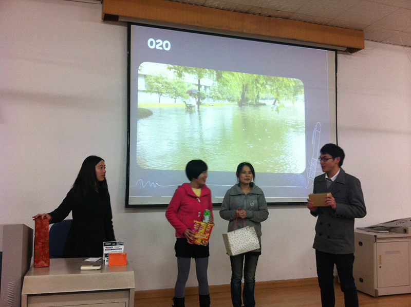 2013年11月21日晚上,0908班全体成员在教室放映投稿照片,同时票选出比赛名次。部分参赛同学还给照片配上了有趣的解说,那些被忽略的美好时候又一次分享,让学习的压力似乎也在此刻暂时舒缓,开始见习之后,班级同学往往以小组活动,大家齐聚一堂相互了解的机会并不多,大家都很享受这一瞬间共同的爆笑和感动。最后王飞同学以一张《美人“俞”看海》夺冠,赵家耀、管晓静同学的两张团体照以人数优势分获二、三等奖,获得了班委精心准备的礼物,同时参与的每一位同学也都获得了小奖品。