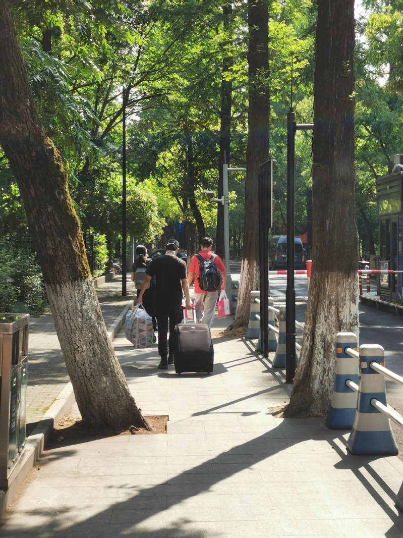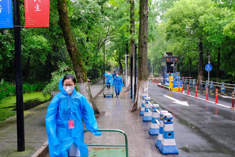 不巧,55日上午,猛烈的暴风雨突袭杭州,进校通道一度被积水淹没,而返校的同学依然不断出现在校门口。志愿者穿着蓝色的雨衣往返在报到点和接驳车停靠站中间短短三十米的路上,他们的脚步在混着枯枝落叶的积水中留下一个个足印,但眼中依然透露出坚定的光。