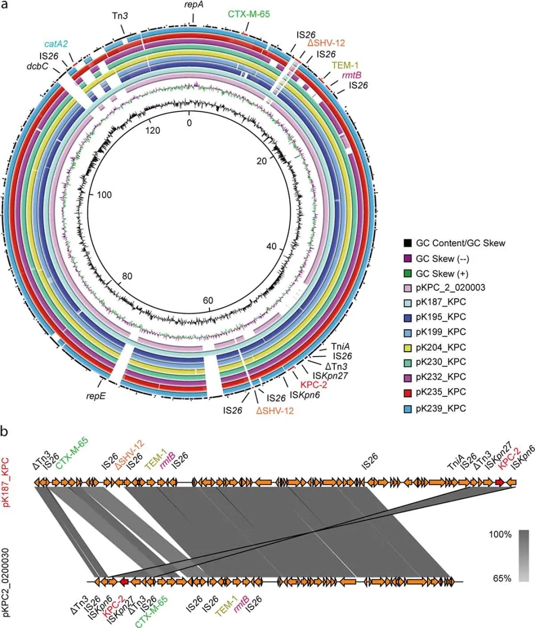 碳青霉烯类抗生素是临床上抵御多重耐药菌感染的常用药物。碳青霉烯耐药的肺炎克雷伯氏菌(CRKP)的凸现与流行,给细菌感染的临床以及公共卫生构成了严重威胁。近年来,高毒力CRKP的ST11克隆在院内感染中被检出。鉴于其同时具备高毒力和耐药性这两种特性,因此引起了较大关注和学术讨论。为进一步探明该ST11克隆在临床上的定植与分布情况,浙医二院的综合ICU双聘教授冯友军课题组与综合ICU黄曼主任研究团队联合攻关,开展了较为系统的比较功能基因组学的研究。该研究采集和分析了23例来自两家不同公立三甲医院的患者标本(浙医二院和丽水市人民医院),对标本菌株的耐药性和毒力进行了系统筛查,探究了耐药质粒与和毒力质粒在ST11克隆群共存的特征 (图1)。