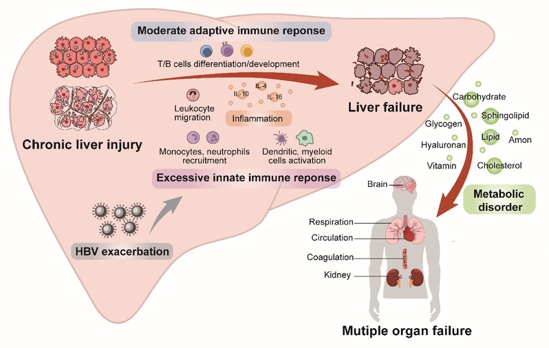 慢加急性肝衰竭(ACLF)是一种在慢性肝病基础上出现的急性肝功能恶化,伴随肝脏和肝外器官衰竭的高病死率复杂综合征,内科综合治疗的短期病死率高达50-90%,其关键原因是发病机制不清。欧洲肝衰竭研究联盟(EF-CLIF)研究发现系统性炎症反应是酒精肝、丙肝等人群ACLF发病的关键机制,但我国乙肝人群ACLFHBV-ACLF)的发病机制至今没有系统阐明。