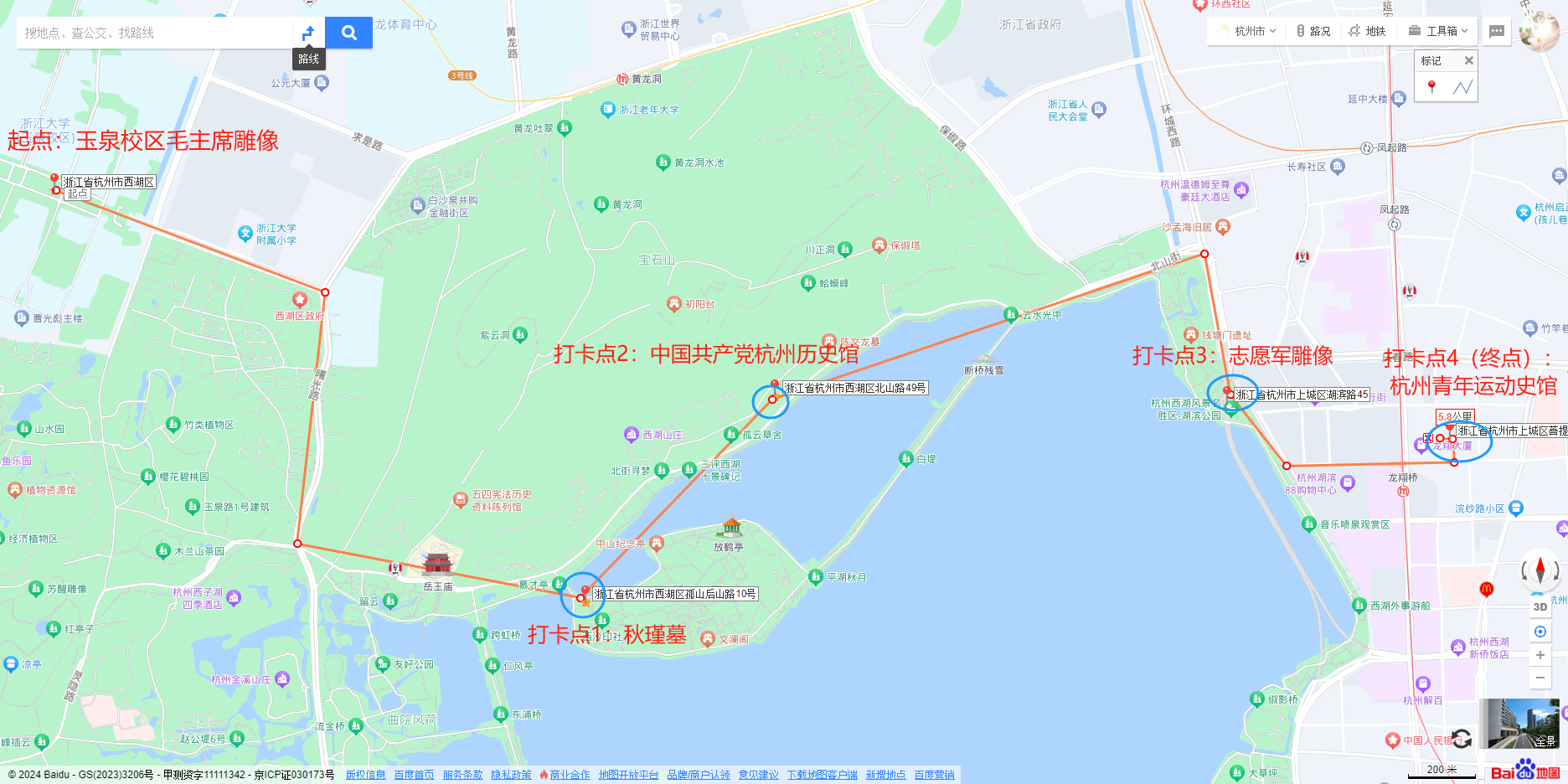 玉泉校区毛主席雕像-浙大路-曙光路-北山街-打卡点1:秋瑾墓-北山街-打卡点2:中国共产党杭州历史馆-北山街-打卡点3:志愿者雕像-学士路-打卡点4:杭州青年运动史馆